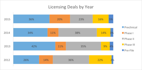 Year 2015 has been buzzing with biopharma licensing deals. Compared to previous years, large pharmaceutical companies have become more aggressive in pursuing early stage assets to replenish their pipelines. Against the backdrop of headline-grabbing mega deals, we have dug into the LSN Licensing Deals Platform to examine the key data points that can tell us about the overall deal-making activity for year 2015. (LSN’s data covers licensing deals, but not M&A activity).