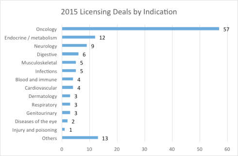 Continuing the trend in 2014, cancer continues to take center stage in licensing deals, accounting for two out of five deals in 2015. CAR-T therapies and checkpoint blocking antibodies were some of the most highly sought themes. However it is noteworthy that diabetes (an endocrine disease) has attracted significant interest this year, with a number of mega deals with major multinational giants.