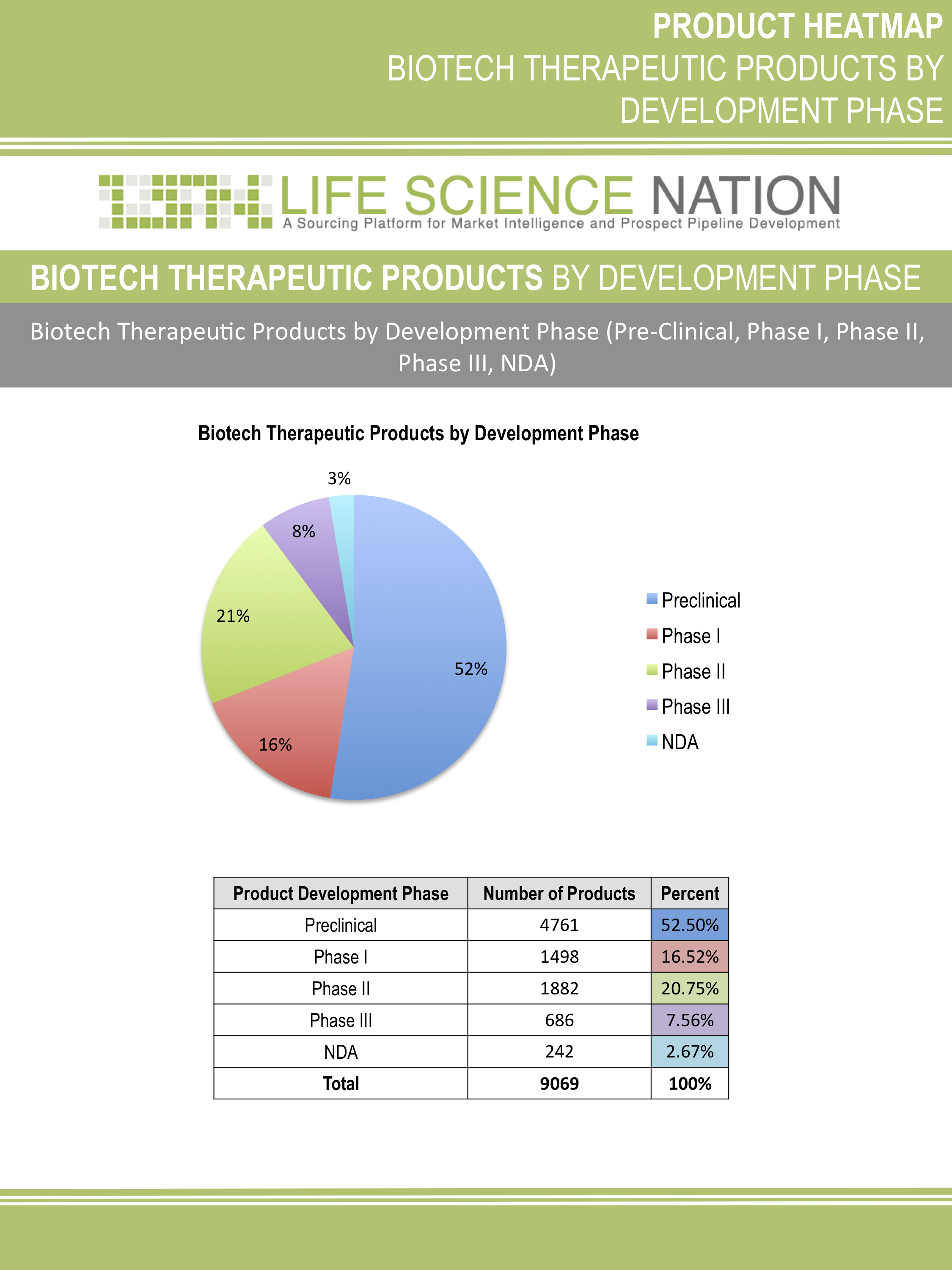 The LSN sourcing platform currently covers 9,069 products in the biotech therapeutics space. Of those 9,069 products 4,761 are in the preclinical phase of the development process, representing over half (52%) of the products covered by the platform. The second largest phase of development represented in terms of biotech products is Phase II (20.75%), followed by Phase I (16.52%), then Phase III (7.56%), and lastly NDA (2.67%).