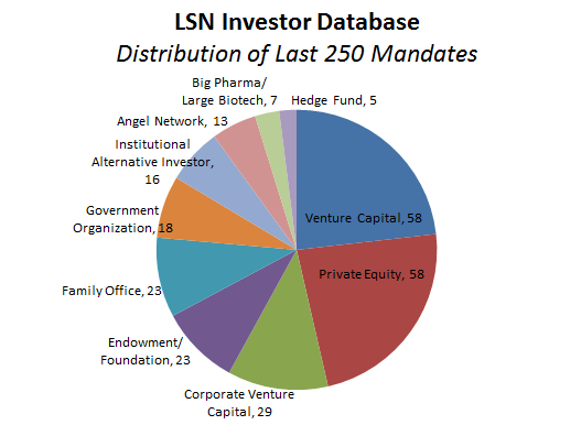 A fascinating piece of information that is presented by the mandate data is that VC comprises less than 25% of the active investors in the space based on forward-looking mandates. LSN has identified about 1,500 VCs in life sciences broadly, and about 500 that claim to be active. However, based on the last 250 mandates collected by LSN research, they are comprising a shrinking percentage of total capital available to companies. This shows that the number of non-traditional investor categories, such as family offices that are going direct, is increasing on a relative basis.