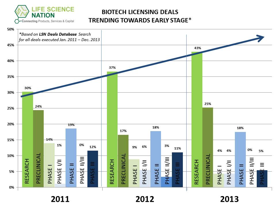 One of the most immediate trends shown by the data is an increased early stage focus as a percentage of deals. This reflects the trend of big pharma relying more heavily on in-licensing to augment R&D pipelines that LSN discussed in late 2012, when it was first emerging. Given the data and conversations LSN Research has had with several big pharma search and evaluation groups, this trend will most likely continue over the course of 2014, as big pharma continues to look at in-licensing as a source of innovative science to shore up pipelines.
