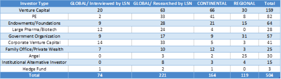 As you can see, about 25% of the investors that are active in these early stage deals reported in BTG financing rounds database are global investors. To further support this, we also pulled data from investors in the LSN Investor Database who are willing to allocate under to $10 million in a single round into Pre-clinical and Phase I stage therapeutics companies.