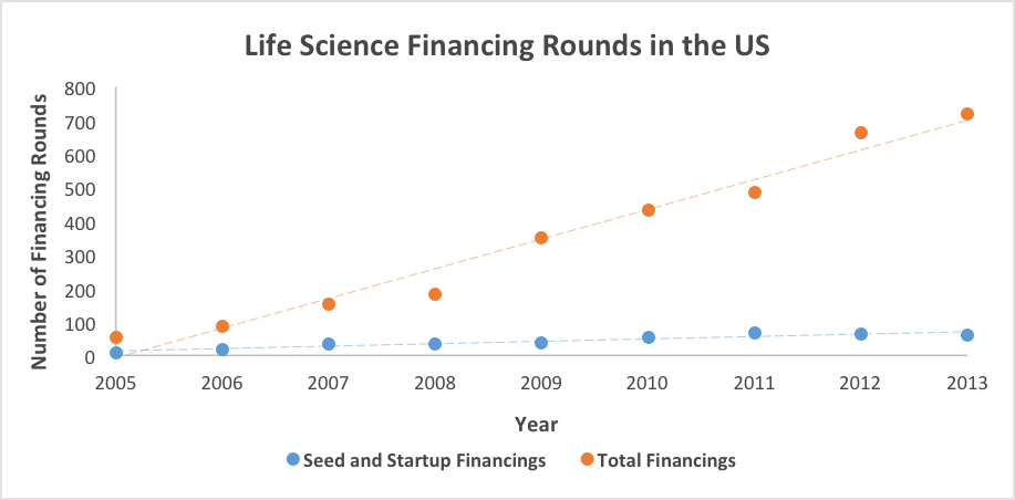 Exhibit 1 demonstrates that, as said by Alexis Borisy (a partner with life science VC firm Third Rock Ventures), “In the overall numbers, early stage life science investment isn’t growing compared to later stage investments.” The disparity in growth between these two variables presents a serious threat to large pharma companies, and provides savvy investors with an opportunity for strong returns. If this trend continues over time, the demand for later stage and more developed technologies will grow to be significantly greater than the supply. Large pharma companies are constantly looking to in-license and acquire technologies for their pipelines in order to protect future revenue streams as patents expire and better treatments become available, threatening their market share. However if there are not enough of these early stage companies getting funded today, then down the road pipelines will go dry.