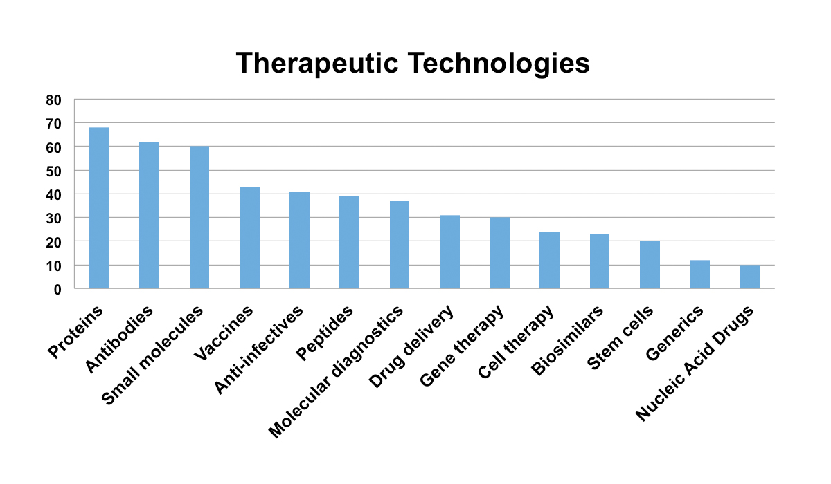 As in the rest of the world, government investment in R&D has resulted in a great diversity of new discoveries. A deeper dive into the data reveals the breadth of technologies that these innovators are pursuing. As shown in Exhibit 2, many therapeutic start-ups in Asia are developing novel biologics.