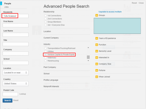 Another often underutilized tool is LinkedIn. Similar to Google, LinkedIn search is also compatible with boolean operators, so using these in the search can again improve effectiveness. LinkedIn also offers an Advanced People Search feature that includes keywords, company name, industry and location among other details, as seen below. An additional benefit of using LinkedIn is that investors and others who are active LinkedIn users with complete profiles are often more open to being approached with opportunities. As LinkedIn is a professional networking site, these individuals tend to be more open to new contacts, and may even be actively looking to expanding their networks and uncover new opportunities.