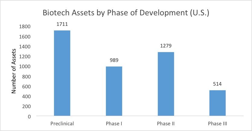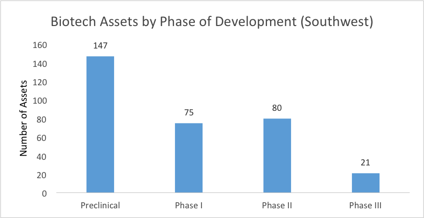 The skew toward early stage assets is greater in these seven states than it is for the nation. There are 7 preclinical assets for every 1 asset that reaches Phase III, whereas for the U.S. as a whole, there are 3.3 preclinical assets for every 1 asset that reaches Phase III. The skew could be because strong companies leave for the East Coast or the West Coast or are acquired by entities based in other regions before the lead asset reaches Phase III. It could also be due to a more restricted funding environment, which may make companies more likely to close their doors after mixed results in Phase II.