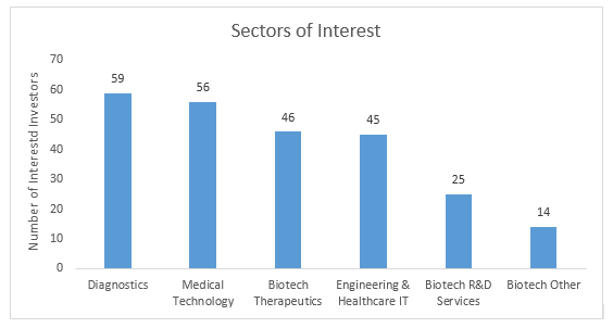 The investors we contact have varied interests across the life sciences; some invest opportunistically in any part of the field, whereas others focus on a particular area of speciality. In February 2015, the diagnostics sector attracted interest from the greatest number of investors, followed by medical technology and biotech therapeutics (see Figure 4). We’ve found from our discussions with investors that diagnostics companies receive attention from both medtech investors interested in diagnostic devices and imaging technologies, and also from biotech investors interested in molecular diagnostics and personalized medicine. In addition to these three sectors, we also speak to investors who are interested in engineering companies (including companies developing lab equipment or healthcare IT products), biotech R&D companies (including CROs), and other biotech opportunities such as industrial biotech or agricultural biotech.