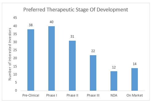 Figure 6 shows the stage at which biotech therapeutics investors prefer to invest. In this sector, you can see that interest in fully developed products drops off sharply, due to the much longer development cycle involved.