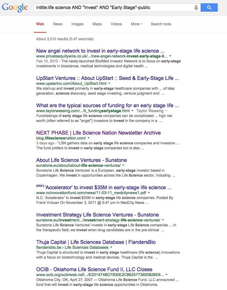 Thanks to the use of Boolean operators, the search above yields only web pages that have “life science” in the title, include both “invest” and “early stage” somewhere in the text, and do not include the word “public.” As shown, this one simple search yields a number of early stage life science investors on just the first page of results. When using these operators for your own fundraising campaign, you should tailor the search to include keywords that describe the profile of your opportunity. These include your stage of development, indication, technology type, and any other information that can be associated with your company or product. You can also narrow your search based on the type of investor you are interested identifying. Whether you are seeking Family Offices, Corporate Venture Capital, Venture Philanthropy, Venture Capitalists (VC), or any other class of investor, you can focus on them by including the investor class in quotations in your search.
