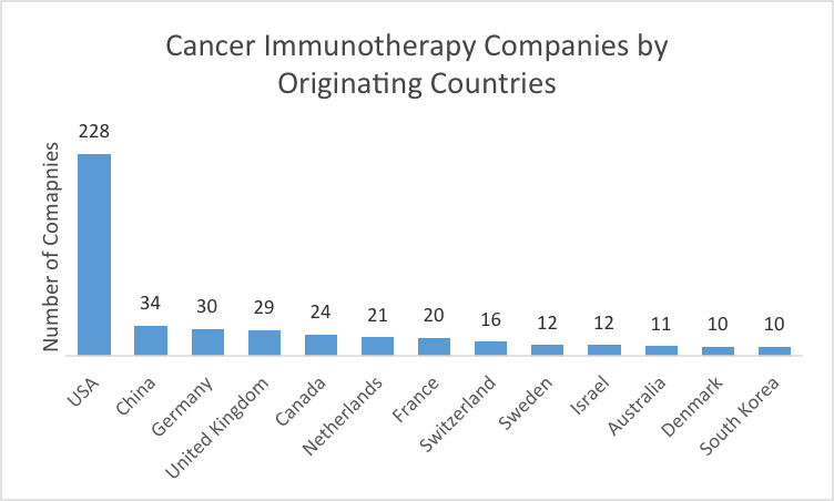 With more than 30,000 company profiles, LSN’s company platform provides a bird’s eye view of the global early stage biotech and medtech R&D landscape. Our search in the LSN company platform yielded 522 unique companies that are currently developing at least one cancer immunotherapy product. About one-fifth (119) of them are publicly listed, while the rest are private or subsidiary companies. Cancer immunotherapy R&D has become a global phenomenon with the United States as the leader in terms of number of companies, followed by China, Germany, the United Kingdom, and Canada, as shown in Figure 1.