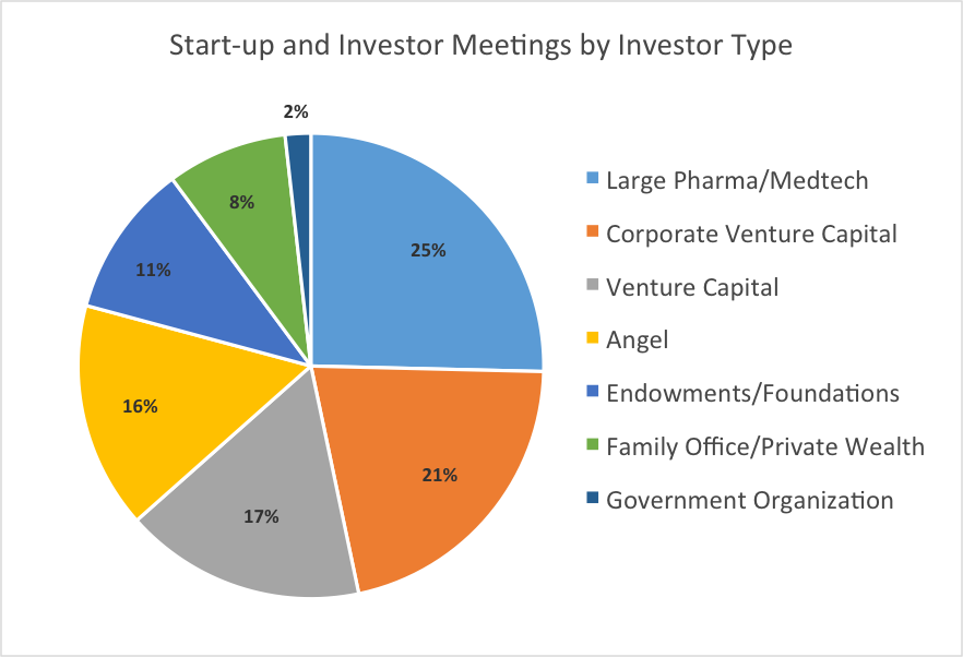 The diversity of investor groups who are taking meetings helps to ensure that entrepreneurs have the chance to evaluate the full spectrum of private funding and partnership options. Large strategic companies in the pharma and medtech spheres along with their corporate venture divisions have taken nearly half of the total meetings. This could reflect the increasing level of interest from these players in identifying external innovation and building relationships early on. Both venture capital firms and angels represent a similar number of meetings taken followed by endowments/foundations and family offices. Understanding the types of active investors for which your opportunity is best positioned is crucial to your success as an entrepreneur, and very few conferences offer the diversity of investors that RESI brings to the table.