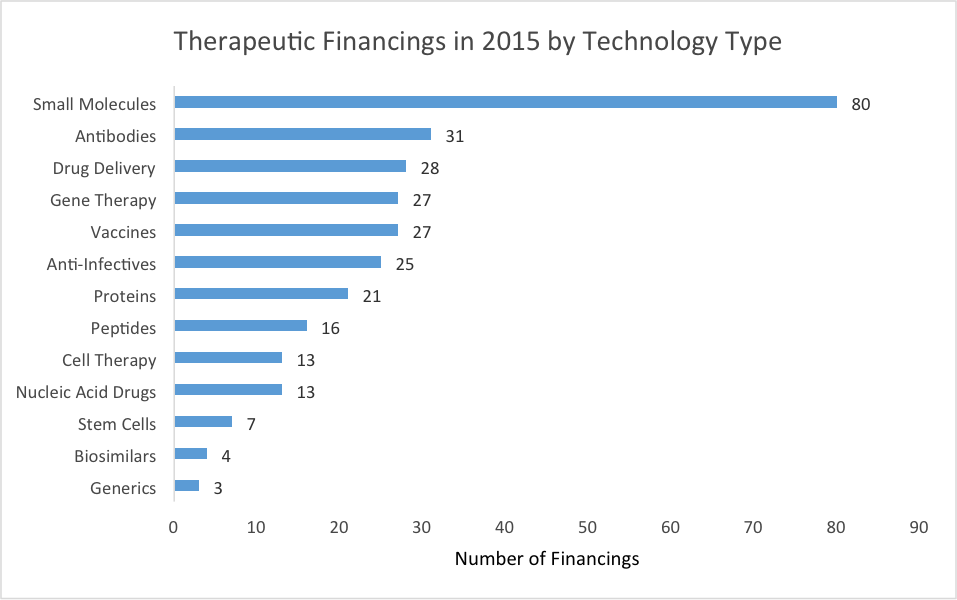 While small molecules are still receiving the highest number of individual financings, in the early stage (preclinical and Phase I) they are ahead by a significantly smaller margin. Also, at this early stage we see gene therapy taking the number two spot, receiving 33% more financial rounds than antibodies. These companies include those working toward single gene mutation orphan diseases whose expedited regulatory approval process attracts investors, as well as those utilizing recent advancements in gene therapy to develop novel treatments for various cancers, diseases of the eye, and HIV/AIDS.