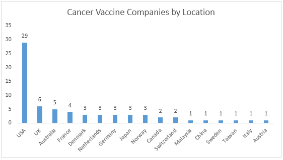 The LSN Company Platform provides detailed profiles on early-stage life science companies and products under development worldwide. From this data, we took a sample of vaccine companies developing therapeutics for the oncology sector. This sample consisted of 69 companies. While a significant number of these companies are based in the USA, we also found information on companies developing cancer vaccines throughout Europe and the Asia-Pacific region.