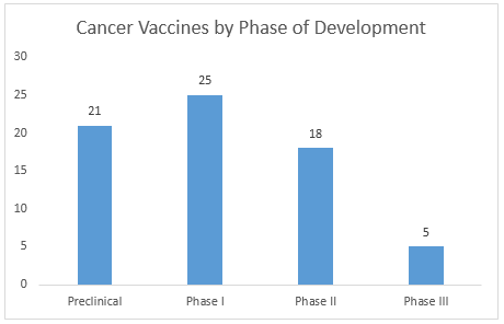 Only 5 cancer vaccine assets in this sample are currently undergoing Phase III trials. This affirms the perception that cancer vaccine technology is a field that is approaching maturity; the many early-stage assets identified by the LSN Company Platform show the field’s potential, but few cancer vaccine assets are likely to reach market in the near term. However, investors interested in early stage immuno-oncology assets will be closely watching the field’s progress.