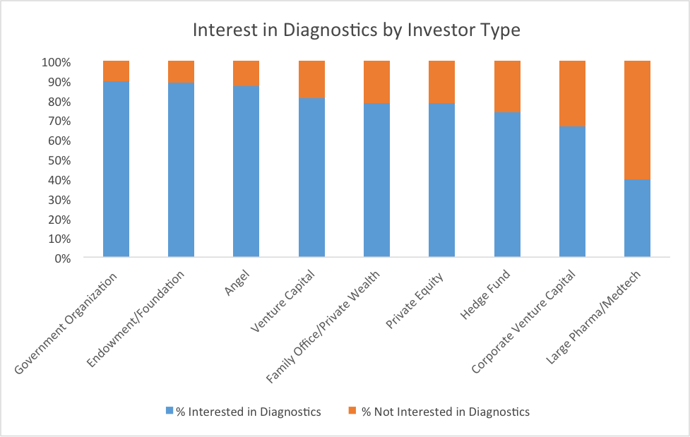 At LSN, we have spoken to over 900 investors in the last year about their specific interests and investment criteria in the life science space. Figure 1 shows the percentage of investors by type who have expressed interest in diagnostic products or services.