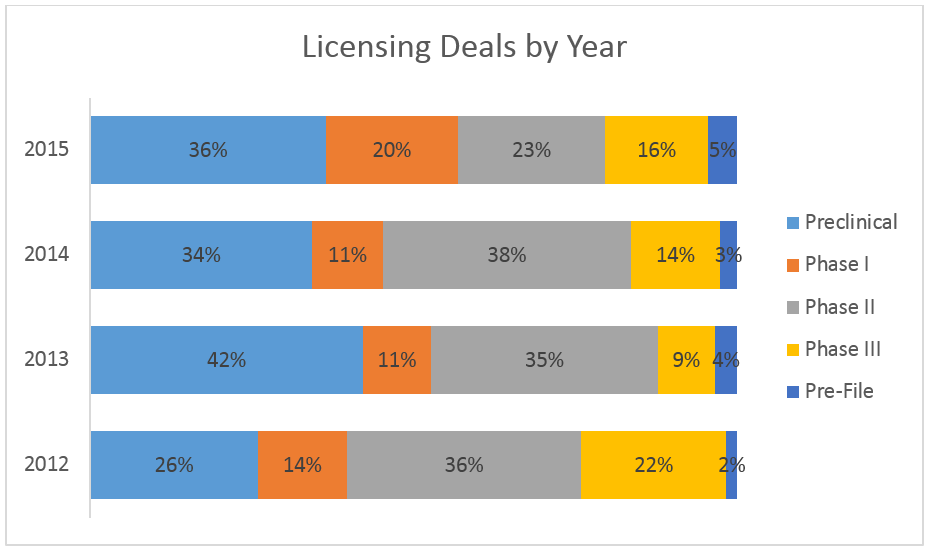 While previously big pharma companies were turning to de-risked projects, this year we have seen a return of interest in early stage assets. Preclinical and phase I projects accounted for over half of the licensing deals. This optimism is partially fueled by scientific advancements such as gene and cell therapies. It is important for startup entrepreneurs to observe the trend and identify strategic partners even at a very early stage.