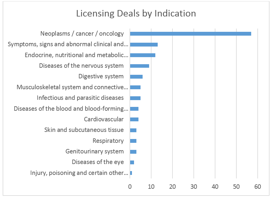 Continuing the trend in 2014, cancer continues to take center stage in licensing deals, accounting for two out of five deals in 2015. CAR-T therapies and checkpoint blocking antibodies were some of the most highly sought themes. However it is noteworthy that diabetes (an endocrine disease) has attracted significant interest this year, with a number of mega deals with major multinational giants.