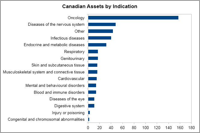 In terms of indication areas, oncology is by far the largest field. Canada also has significant pipelines in CNS disorders, infectious diseases, and metabolic diseases.