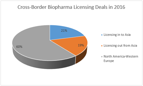 As the diversity of buyers increases, so does the scope of their investment. Backed by highly trained workforce and ‘returnee’ scientists, Asian biopharma industry has demonstrated strong ambition in innovation. Instead of focusing on snatching mature businesses, Asian biopharma companies are now active in swapping assets with their US and West European counterparts. According to LSN Licensing Deals Platform, Asia accounts for 40 percent of all global cross-border biopharma licensing deals from January to August this year (see Figure 1).