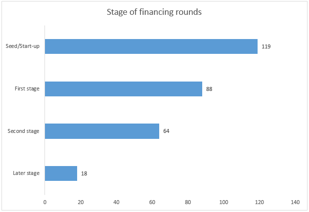 In some of the rounds it was possible to identify the stage of equity financing that occurred. This isn’t always cut and dried, as many life science companies raise bridge rounds or issue convertibles, and seed financing in the life sciences may come in the form of a grant rather than an equity investment. However we’ve found that where stage data is clear and available, most of the recorded financings occurred at the seed stage, with a drop-off that steepens beyond the second-stage (Series B) financings. This data covers equity rounds into privately held companies only, so those that obtained financing by other means (such as a major partnership, venture debt, or an IPO) aren’t included in this data set.