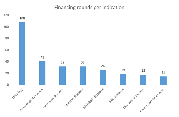 In biotech, we’re able to identify the indication areas in which the companies are operating. Many life science companies are working on assets in multiple indication areas, and some assets cut across multiple indication areas; for example, a company targeting HIV may be counted as both an infectious disease company and an immune disease company). The below chart shows the top indication areas: oncology remains the most financed area by far, followed by CNS, infectious disease and immunology.