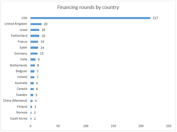 Where are life science companies receiving equity investments in 2016? Looking solely at biotech, medtech and healthcare IT companies, we found that our dataset mostly consisted of financing rounds in the USA. However, biotech and medtech investment is occurring all over the world, with many companies getting funded throughout Europe and Asia. Here are all the countries in which we have data on more than one financing round in 2016: