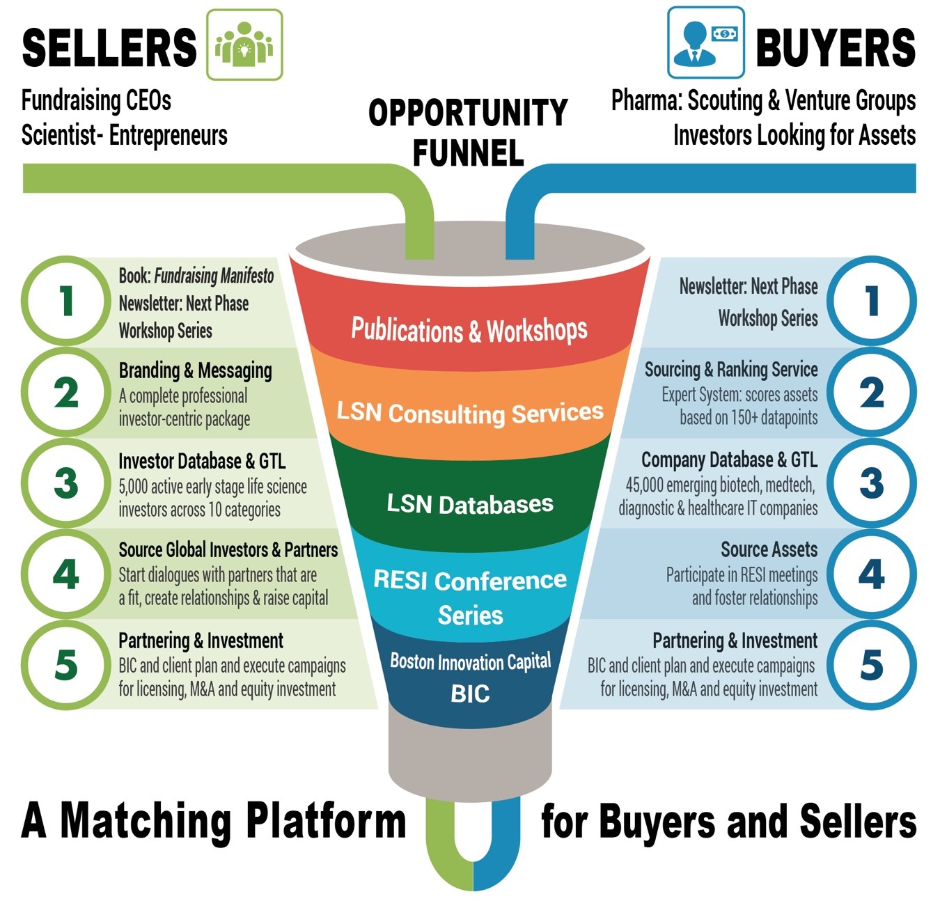 - The ultimate choice is to partner with Boston Innovation Capital (BIC), LSN’s Investment Bank, which will conduct fundraising campaigns for early-stage companies by using the database, RESI conferences, and the BIC partner network and set up the meetings and road trips for you. BIC uses all of the LSN’s IP and produces numerous meetings and increases the probability of fundraising success for select clients.
