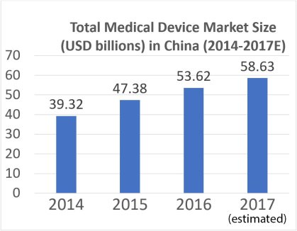 - China’s medical device market from 2015 to 2016 increased by $53.62 billion USD (a 20.1% increase) and this growth rate is expected to be maintained into 2017 as well.