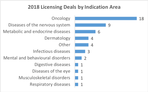 In terms of indication, oncology remains the largest area of dealmaking, but CNS assets also provided a significant number of deals, as did metabolic diseases and dermatology.