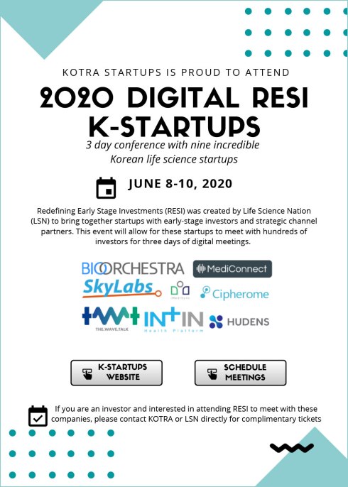 For the upcoming Digital Redefining Early Stage Investments (RESI) Conference from June 8 -10th, Life Science Nation (LSN) is working with the Korea-Trade Investment Promotion Agency (KOTRA) to support a delegation of 9 Korean companies. KOTRA has been a proud sponsor of RESI for three consecutive years, and we are happy that they are leveraging our global platform to support international expansion of promising Korean technologies.
