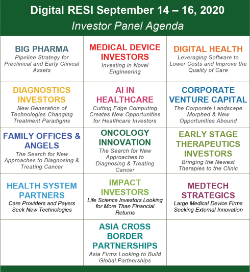 RESI is continuing to improve our digital events, adding features and content to increase the efficiency of interactions between investors and fundraising company CEOs. While RESI is a partnering-focused conference, the panel and workshop content offer key insights for startup CEOs, helping them avoid common pitfalls when interacting with investors. LSN is pleased to announce our panel lineup for our upcoming Digital RESI, taking place September 14-16. With panels focusing on different sectors and indications, such as Medical Device Investors, Diagnostics Investors, and Oncology Innovation, as well as panels featuring different investor types, such as Health System Partners, Seed Funds, and Impact Investors, startups can find a panel of investors that can provide them with valuable tips to help in their fundraising campaigns. While most of the panels will be prerecorded, attendees will be able to listen in to live sessions during the conference, with the ability to submit questions for Q&A. Make sure to register to gain access to this valuable content.