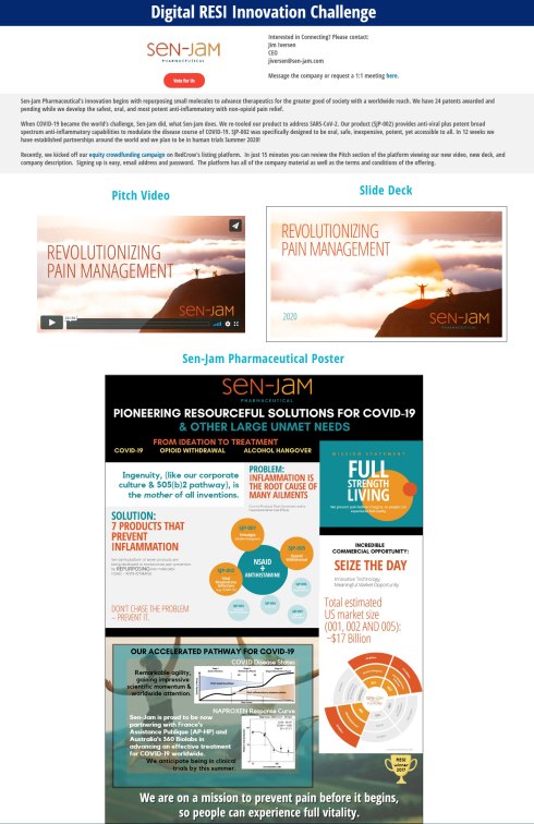 For fundraising life science companies, participating in the Innovation Challenge is a great way to increase visibility. All participating companies will have a dedicated landing page featuring materials (example screenshot below) that the companies can use to promote and direct traffic, just like they would do at an in-person RESI.