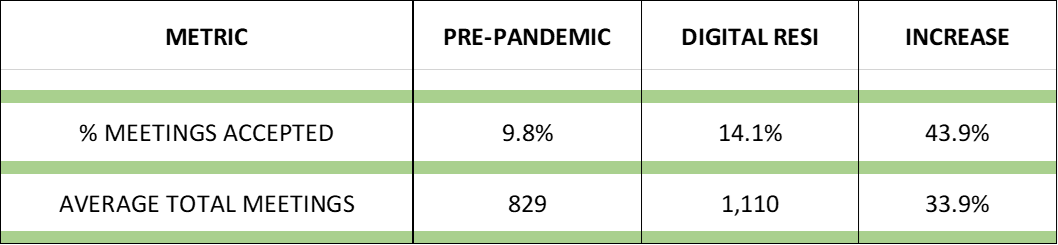 The transition to Digital RESI has enabled the enhancement of the partnering platform, creating many more meeting slots to facilitate meetings among participants from different countries and time zones, mirroring the cross-border industry trends this year. The chart below represents an increase in both the percentage of meetings accepted at the Digital RESI conferences as compared to the pre-pandemic on-site conferences, as well as in the average total number of meetings taking place at each conference.