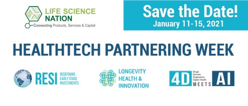 The Inaugural Life Science Nation (LSN) Healthtech Partnering Week 2021 launches January 11-15, 2021 with three back-to-back digital partnering conferences: Redefining Early Stage Investments (RESI), 4D Meets AI, and Longevity, Health & Innovation (LHI). These three events make up the ultimate partnering experience within healthcare and life science through their match-based partnering system, as well as pitch sessions, informational workshops, and panels.