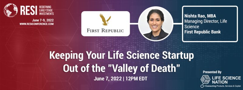 Join Life Science Managing Director, Nishta Rao and First Republic Bank at 12 PM EDT to learn how to keep your startup out of the “Valley of Death” and how a solid banking partner can help and add value to the early stage. Additional speakers include: