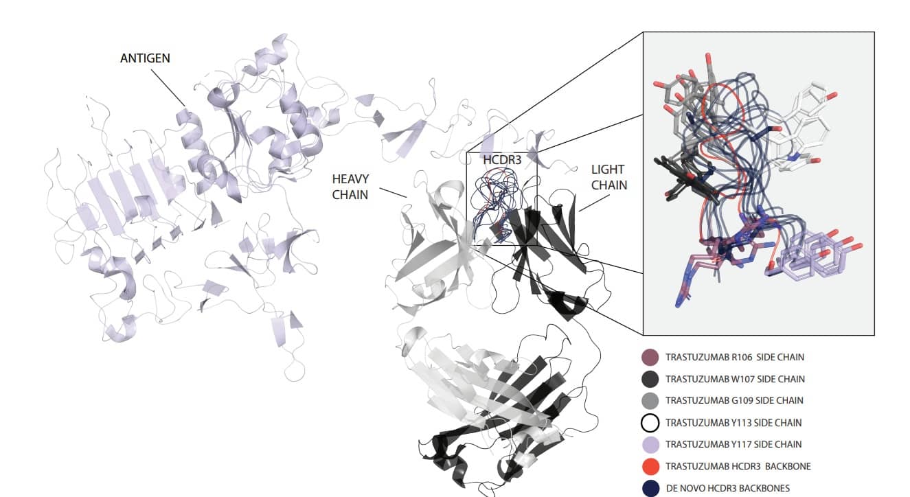 Baker and his team further challenged their method with the more difficult problem of de-novo scFv design, which requires simultaneous construction of six CDR loops across two amino acid chains. The team introduced a combinatorial assembly strategy in which heavy and light chains from structurally similar designs were mixed to overcome cases where a single imperfect CDR would compromise binding. This enabled the discovery of scFvs targeting the Frizzled epitope of TcdB and a PHOX2B peptide–MHC complex. Cryo-EM validation of two scFvs showed that all six CDR loops matched the design model with near-atomic precision.