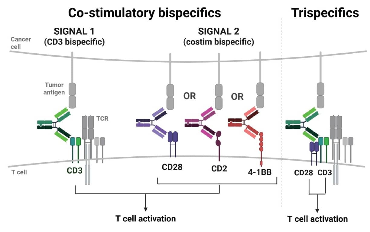Perhaps the best example of this comes from the field of T-cell engagers (TCEs). A tri-specific antibody can incorporate not only tumor-cell binding and CD3 engagement, but also a co-stimulatory domain, such as CD28. This can boost T-cell activation, persistence and potency more than a bi-specific that only binds to CD3.