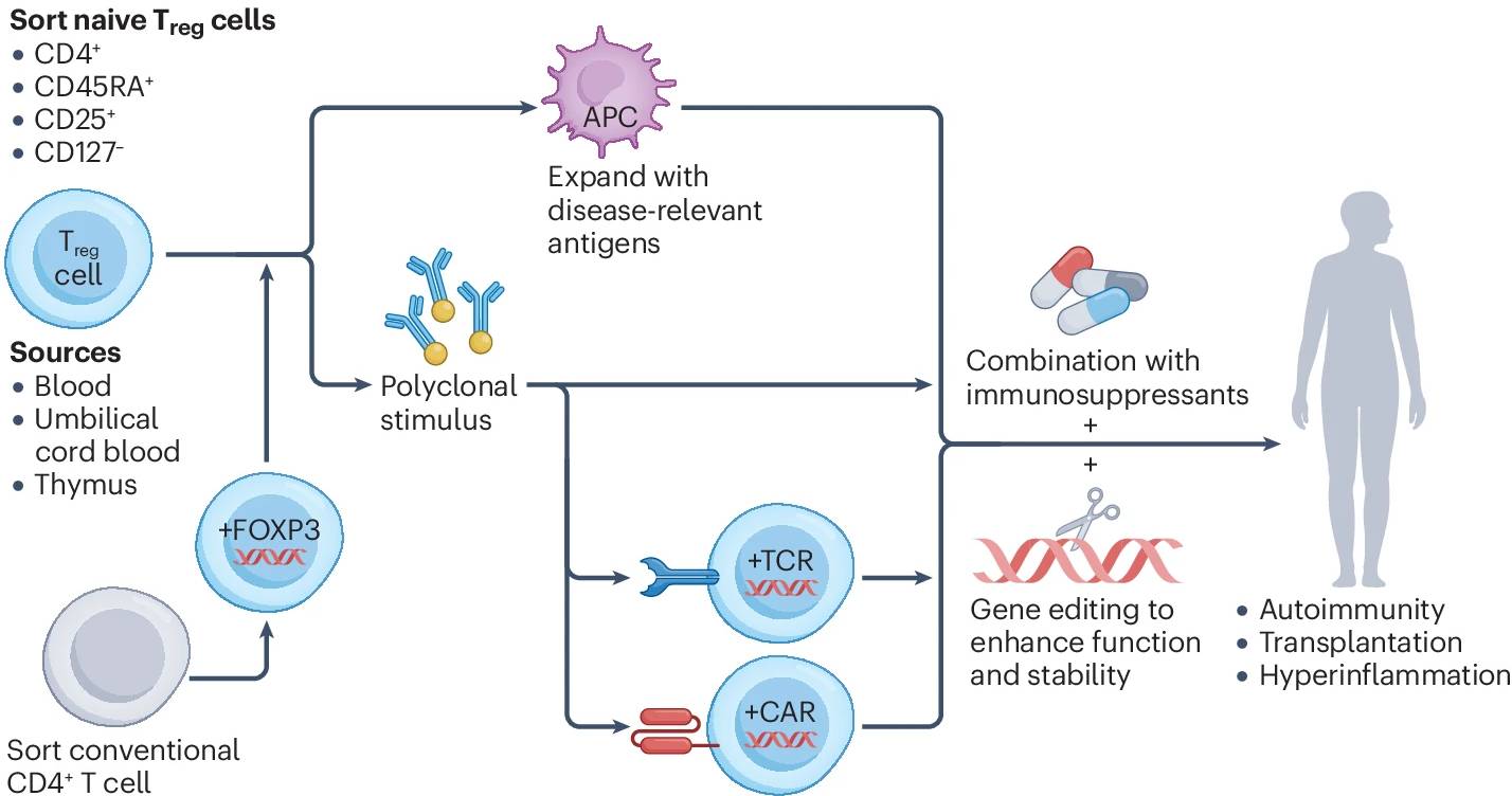 The overarching idea behind Treg cell therapy has been to isolate these cells from a patient, introduce/upregulate expression of the FOXP3 transcription factor that marks them from other T cells, and expand them before giving them back to the patient.