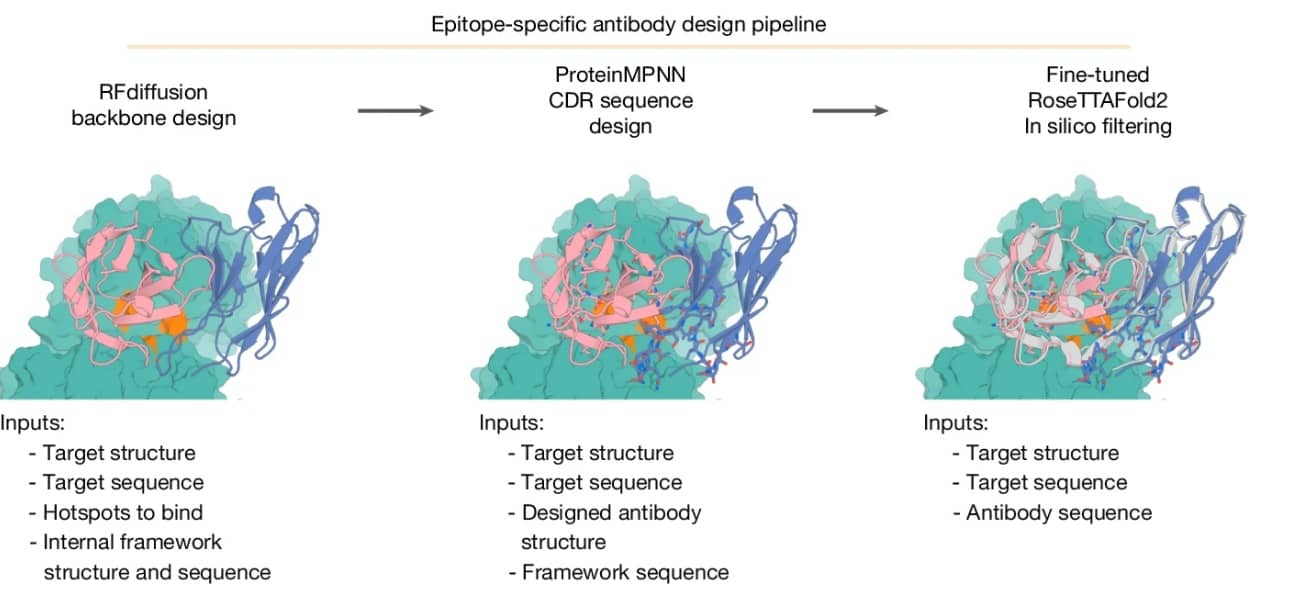 Although therapeutic antibodies represent a $160 billion-dollar annual market and comprise a third of all approved drugs, discovering new antibody molecules remains a labor-intensive process, requiring slow experimental approaches with low hit rates, such as animal immunizations and or the panning of phage- or yeast-displayed antibody libraries. The drug hunter’s dream would be to design an antibody to any target by simply entering information about that epitope into a computer. Now that dream is one step closer with a recent proof of principle peer-reviewed paper published in Nature on work disclosed last year from the team of 2024 Nobel Laureate David Baker. Baker and his colleagues at the University of Washington introduce the first generalizable machine-learning method for designing epitope-specific antibodies from scratch without relying on immunization, natural antibody repertoires, or knowledge of pre-existing binders.