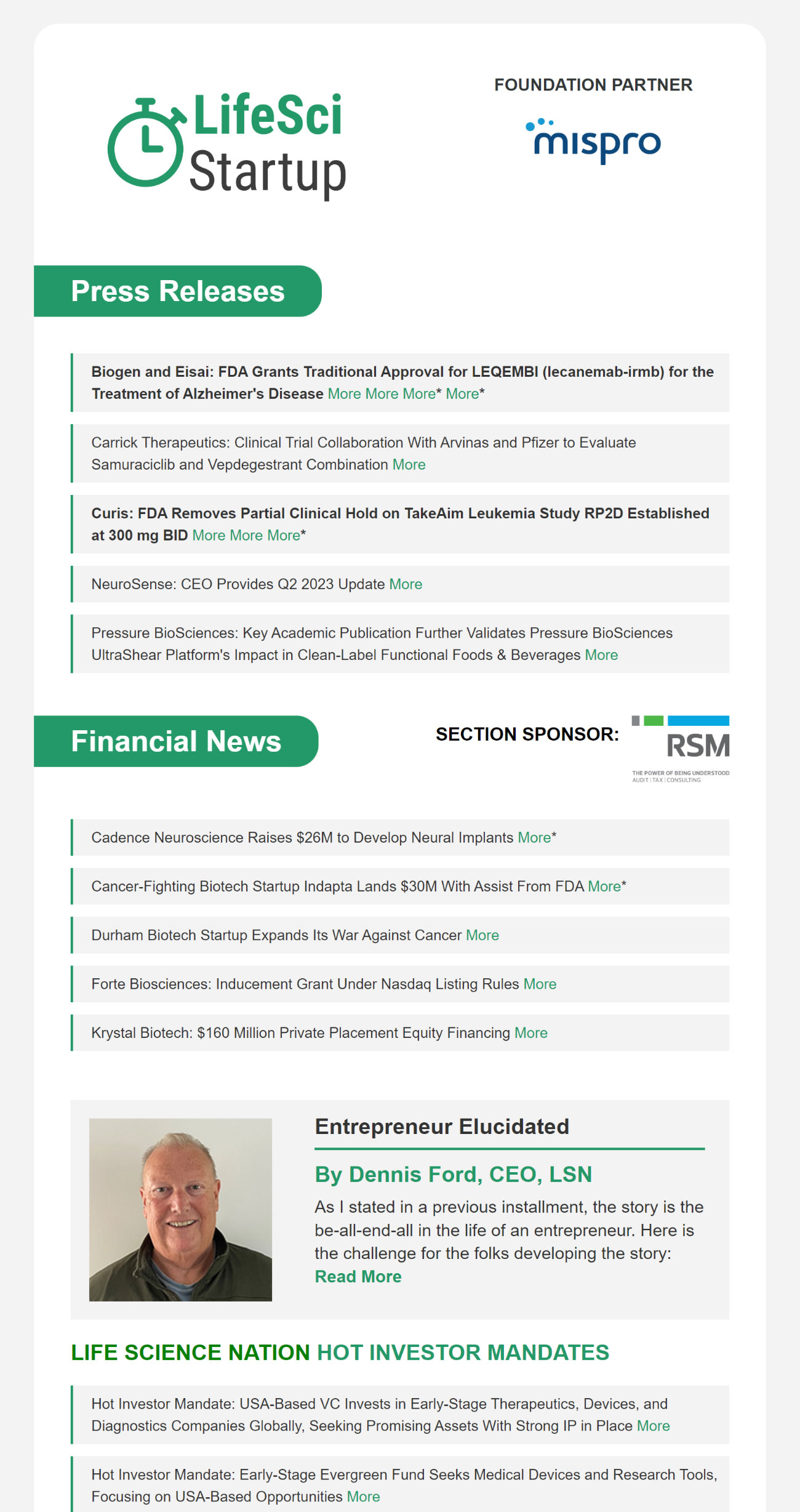 Life Science Nation (LSN) is excited to announce LifeSci Startup, a daily newsletter from LSN and Big4Bio. This is a daily newsletter recapping the latest developments of life sciences startups. From life-saving drugs to economic impact, the life science industry and community need constant coverage and supporting resources. Earlier-stage companies are key to advancing this industry, providing job creation, capital formation, and entrepreneurial inspiration. A dedicated daily digest is needed to support these efforts, and LifeSci Startup does that by providing key news, events, jobs, investor mandates, and more.